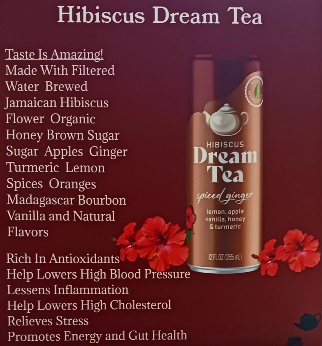 Introducing our premier tea - Hibiscus Dream Tea! Made with Ginger, Turmeric, Honey, Lemons, Orange Peel, Vanilla, Apples, and many more delicious and healthy-driven ingredients. Sold nationwide, our Hibiscus Dream Tea was created 3 years ago. It can be consumed hot or cold, aids in lowering high-blood pressure, regulating gut health, and your A1C. Our Hibiscus Dream Tea promotes energy, is loaded with antioxidants, and has an amazing taste!